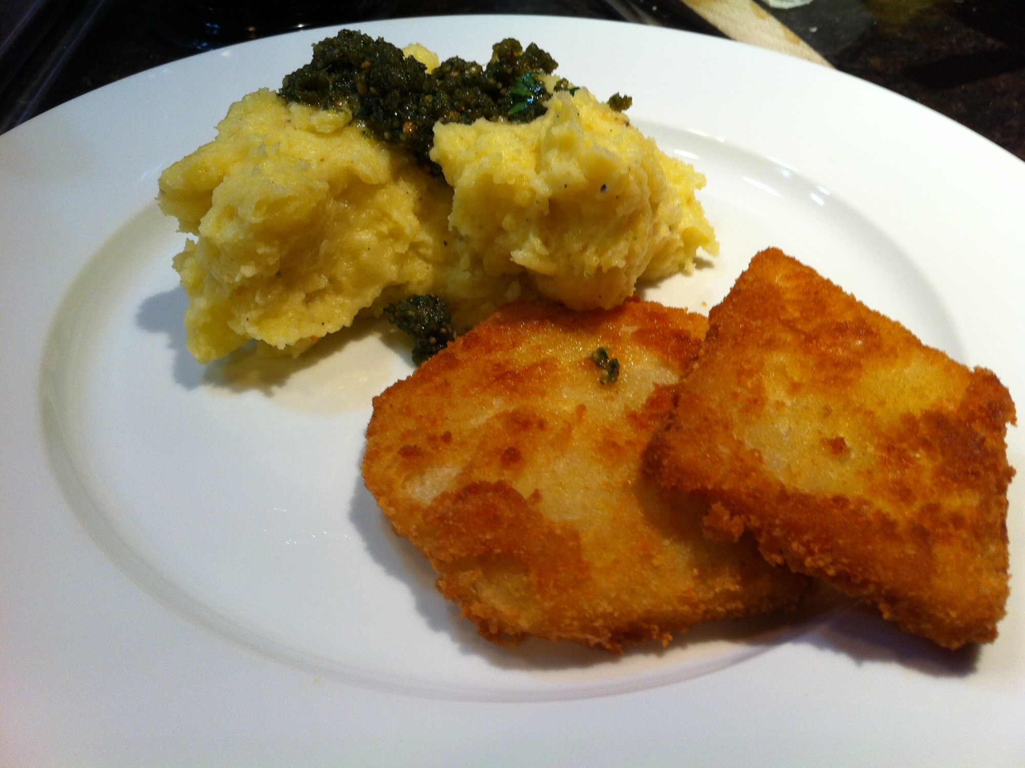 Ich muss sagen, dass die Minze im Hintergrund gepaart mit dem Zitronenabrieb eine schöne Frische gibt. Der Knoblauchgeschmack bleibt durch den Bärlauch auch dezent. Lecker. Zu was wir die Pesto verspeist haben? Auf Kartoffelpüree, der mit Olivenöl angemacht war und Kohlrabischnitzeln, wie man auf dem Bild sieht. Die Reste habe ich dann auf Brot mit Frischkäse gegessen. Schmeckt schön grün!
