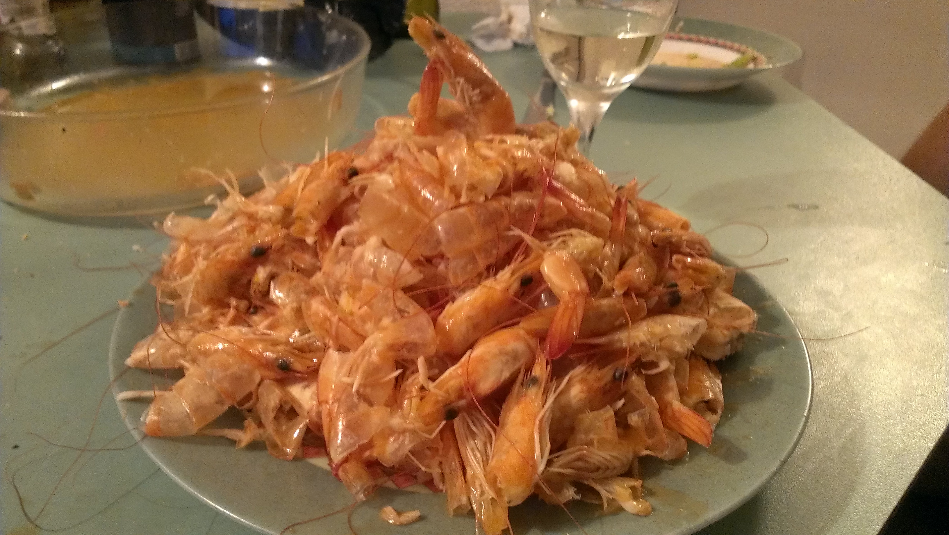Die Bretagne verfügt wie oben erwähnt über herrliche Wochenmärkte, es gibt zwar nicht auf jedem einen Fischstand, aber es gibt ja noch genug Markthallen und tatsächlich sehr gut ausgestattete Supermärkte. Wir haben uns 1 kg Crevetten besorgt für lächerliche 13 Euro, guten Lambig, gutes Baguette und gesalzene Rohmilchbutter, über die ich noch gesondert schreiben muss. Herrlich! Lambig ist übrigens das, was Ihr unter Calvados nennt: destillierter Cidre. In der Bretagne heißt er Lambig.