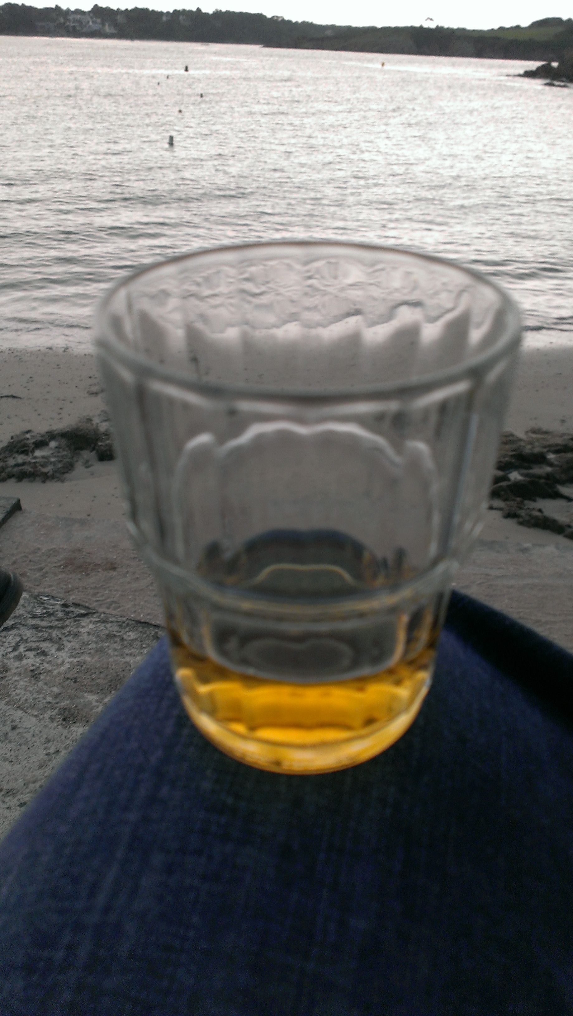 Als Digestif empfehle ich eben den eingesetzten Lambig. Wo Ihr den einnehmen solltet? Am besten da, wo wir ihn auch einnahmen. Am Strand unterhalb des Apartments. Das sieht dann so aus: