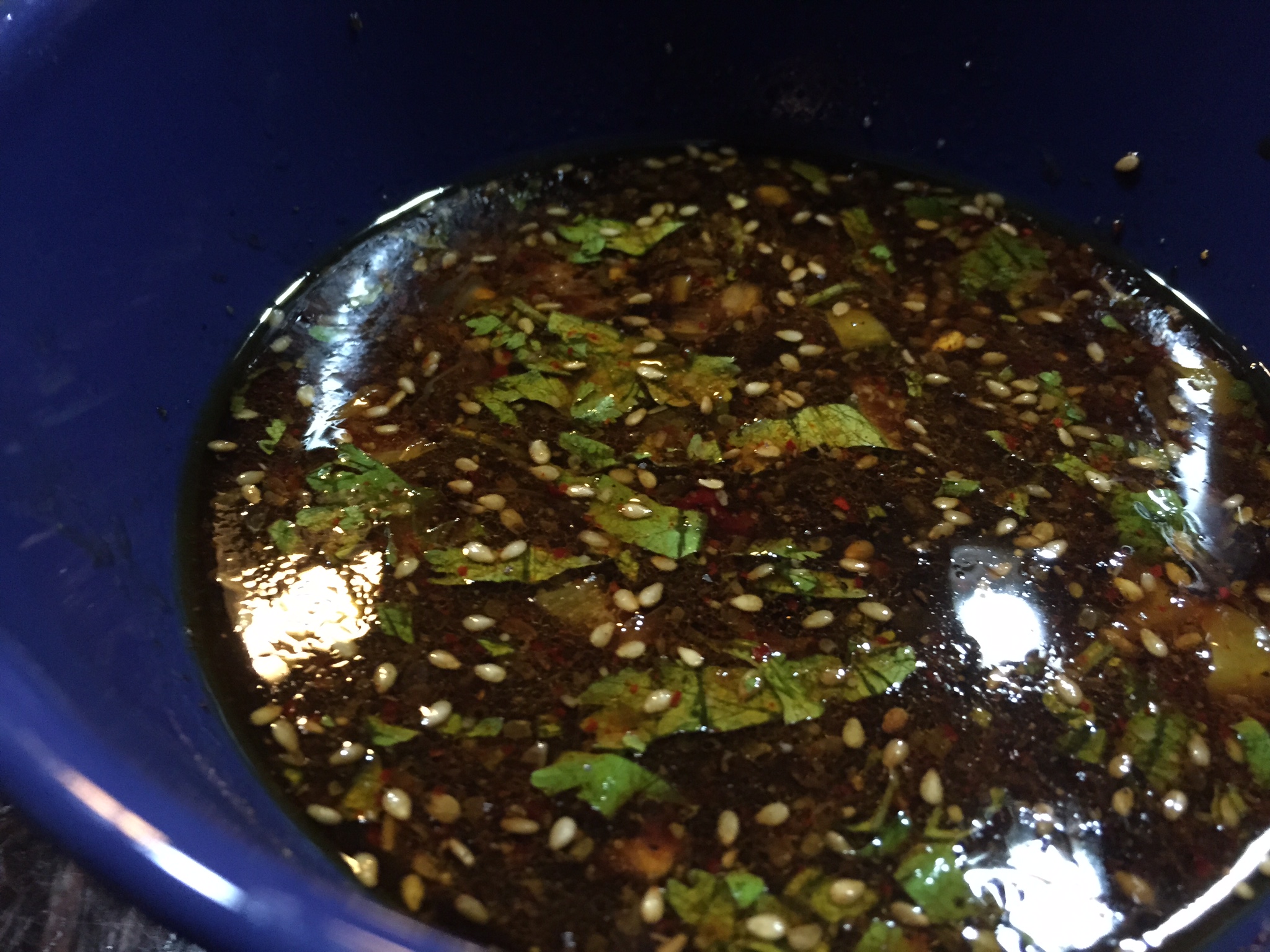 Klein gehackten Koriander zugeben und die klein gehackte Chileschote – wer es besonders scharf mag, sollte Kerne und Haut drin lassen. Solltet Ihr keine Handschuhe verwenden, reibt die Finger mit Öl ab und wascht sie Euch gründlich. Anders bekommt Ihr die Schärfe nicht aus der Haut. Aber jetzt weiter im Saucentext. Nehmt noch eine ordentliche Portion Ingwer, die Ihr entweder reibt oder ganz klein gewürfelt habt und packt sie dazu. Einen Spritzer Fischsauce schadet hier nicht. Jetzt das Ganze mit ein wenig Puderzucker, normalem Zucker oder sogar Honig abschmecken. Gut verrühren. Zum Schluss einen guten Schuss geröstetes Sesamöl und gerösteten Sesam hinzufügen.