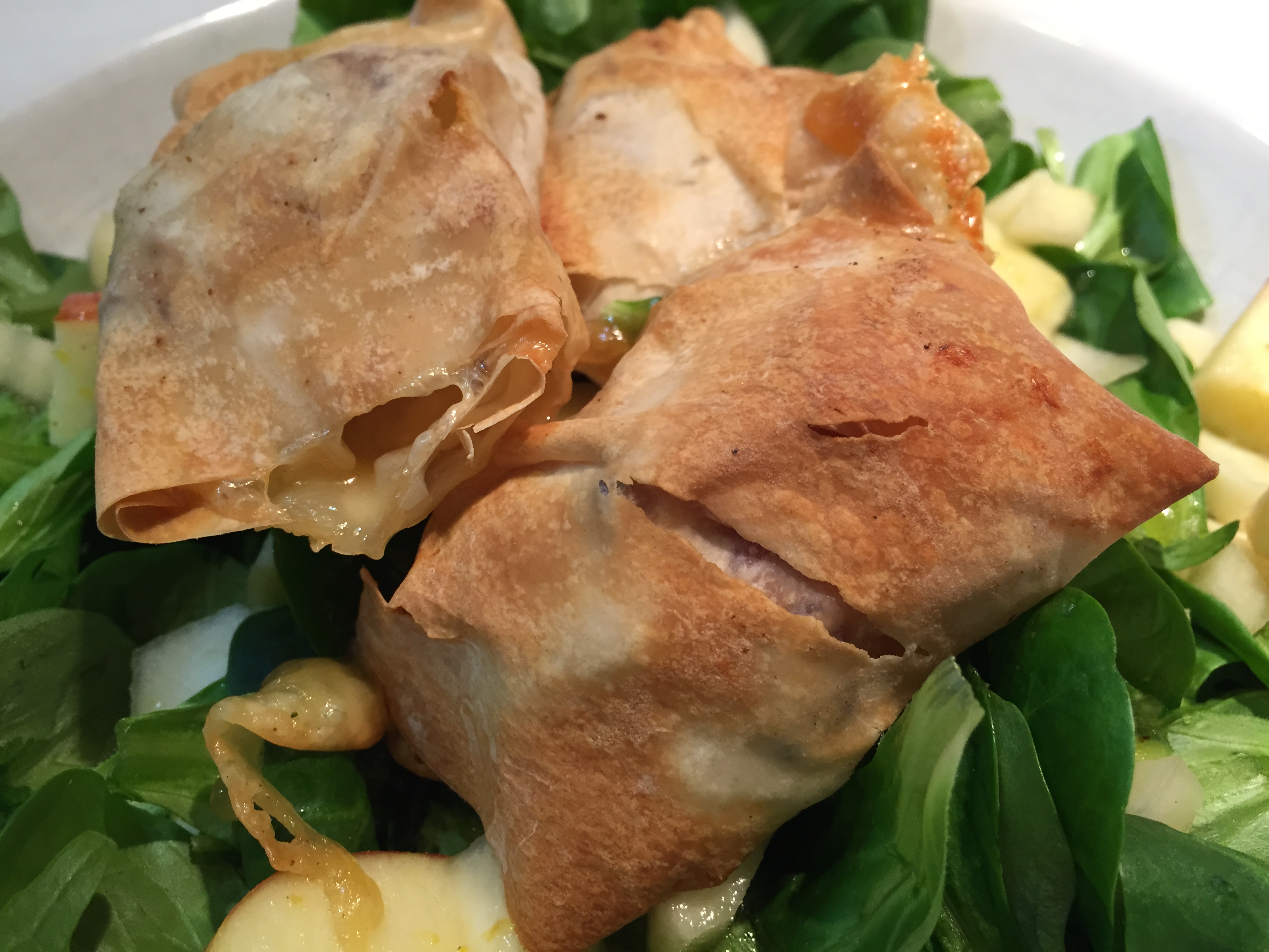 angetan hat mir der 20jährige Calvados, im Eichenholz Fass gereift. Die Marke? Chateau Breuil. Probiert den mal. Lecker weich ist er! Gegessen haben wir wieder sehr exzellent. Ich liebe ja Muscheln / Moules mit Pommes Frites. Moules Frites. Wenn Ihr die Gelegenheit haben solltet, bestellt Moules avec Camembert. Sehr gut! Ich hatte dort auch Croquillante Normande versucht. Ein Brick/Filoteig gefüllt mir Kartoffeln, Camembert und Speck. Das fand ich sehr spannend, wenn auch der Speck mir nicht kross genug gebraten war. Was mache ich also als eines der ersten Dinge, frisch aus dem Urlaub in meiner Küche? Genau das. Brickteig bzw. Filmteig gab es beim Türken. Die anderen Zutaten habe ich besorgt bzw. haben wir vom Urlaub mitgebracht. Die Zubereitung habe ich teilweise aus einem französischen Kochbuch, teilweise aus dem Netz und zum größten Teil habe ich selbst ausprobiert. Aber was spanne ich Euch auf die Folter, hier ist das Rezept: