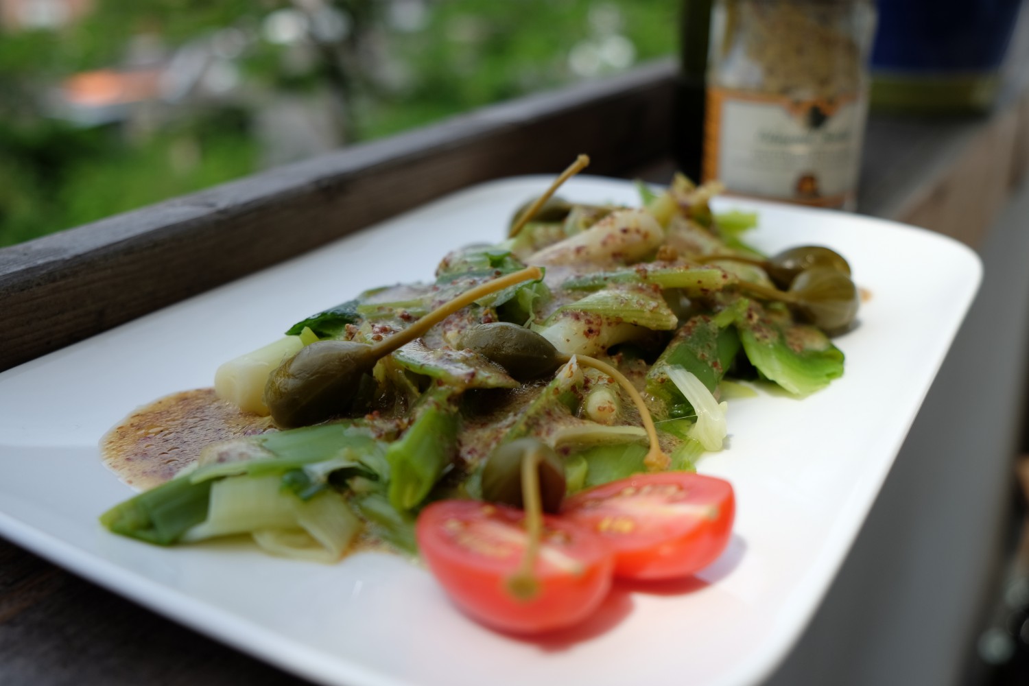 Vom Lauch die oberen, etwas welkeren dunklen Enden abschneiden und das „Bürzel“ unten. Dann die einzelnen Lauchstangen der Länge nach durchschneiden, aber nicht ganz bis zum Ende. Wascht jetzt unter fließendem Wasser sehr (!!!) akribisch die einzelnen Blätter, denn gerade im Lauch versteckt sich gerne Sand. Den Lauch in 6 bis 8 cm große Stücke schneiden. Dann ca. 1/4 l Wasser oder auch etwas mehr in einem weiten Topf mit einer guten Portion Salz zum Kochen bringen, den Lauch einlegen und zugedeckt ca. 10 Minuten bei mittlerer Hitze bissfest kochen. Anschließend den Lauch über einer Schüssel in einem Sieb abtropfen lassen. Den Sud braucht Ihr noch! Jetzt den Lauch unter kaltem Wasser abschrecken. Das aufgefangene Kochwasser lasst Ihr jetzt stark einkochen, bis auf ca. 2 EL. Dann selbiges Kochwasser mit Essig, Salz, Pfeffer, Honig, Senf und Olivenöl abschmecken, die Kapern dazu geben. Lauch auf eine Platte legen, die Vinaigrette rüberträufeln, wenn Ihr keine kleinen Kapern im Haus habt, die großen drapieren und 4 Stunden marinieren. Dazu passt geröstetes Baguette und natürlich ein Kräuterquark (siehe auch mein Rezept hier). Begleitend hierzu ein schöner Weißwein, der nicht zu säurebetont ist – ein Lugana zum Beispiel oder ein schönes kräftiges IPA.