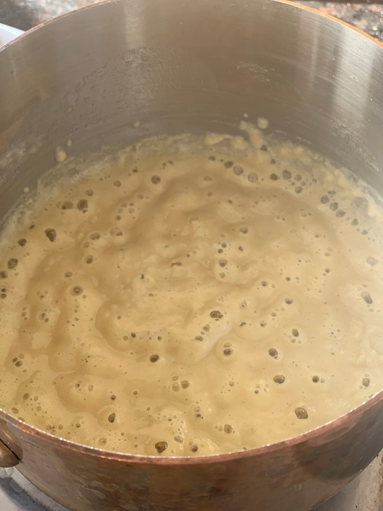 Jetzt die Pfanne kurz vom Feuer nehmen und ein Schlückchen der aromatisierten Milch durch ein Sieb dazugeben. Verrühren. Wieder auf die Herdplatte. Weiterrühren und fast alle Restmilch durch das Sieb einrühren. Weiterrühren auf mittlerer Hitze für ca. 15 Minuten. Die Sauce sollte dick und cremig sein. Abschmecken mit Senf, Salz, Pfeffer, Muskat, Piment d’Espelette und am besten einem Schluck Noilly Prat oder auch Weißwein. Das gibt dem Ganzen noch einen Kick. Vom Feuer nehmen.