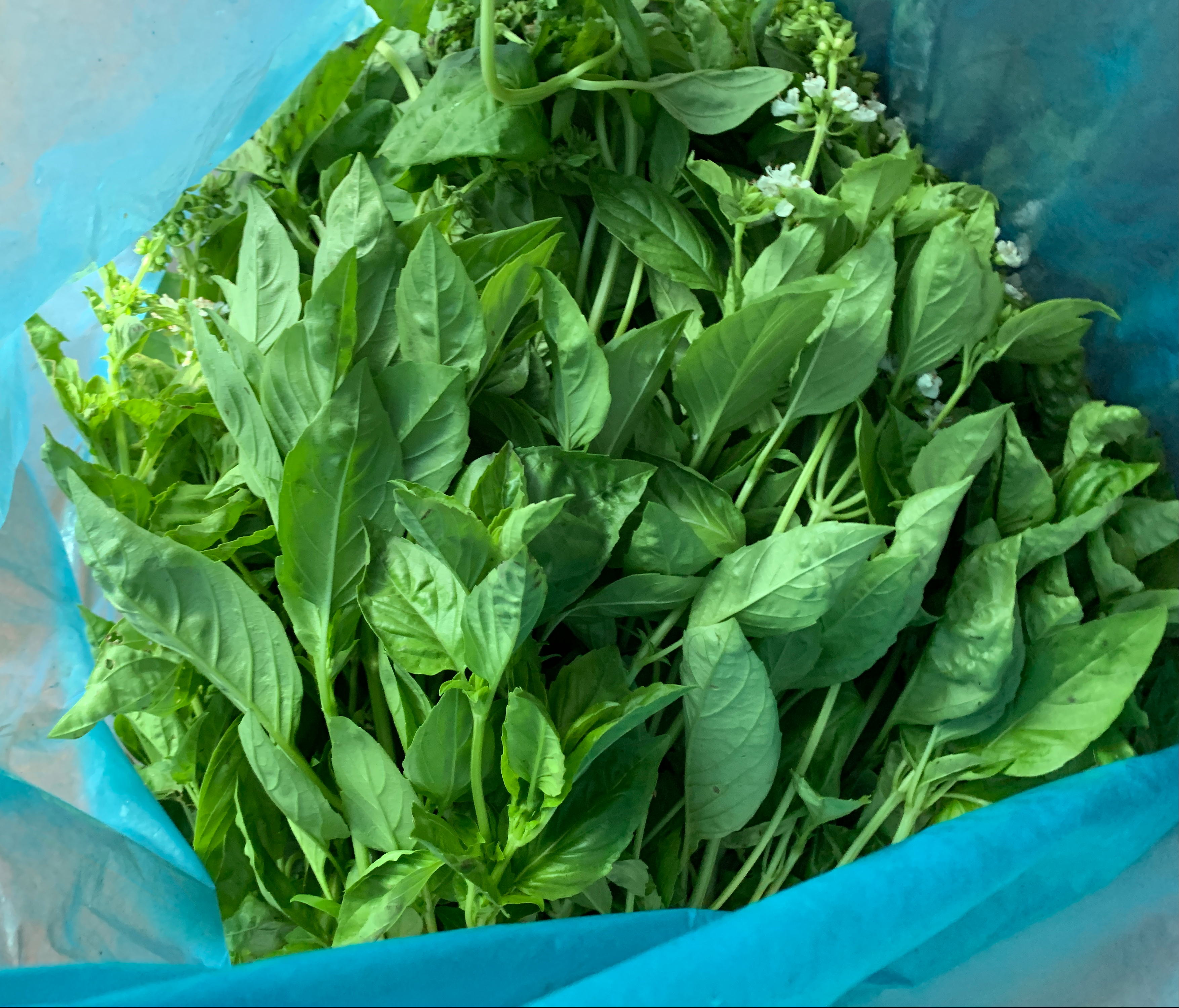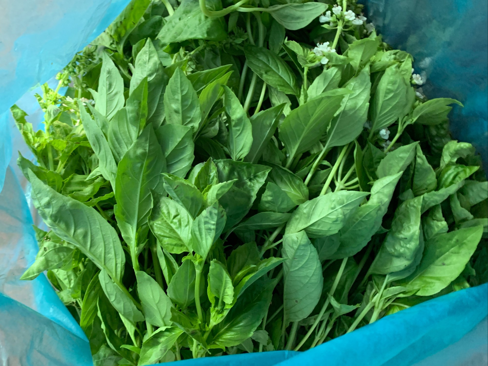 So trägt es sich zu, dass mein fleißiger Gärtner-Mann einen ganzen Sack voller Basilikum anschleppt. Wow. Ich liebe Basilikum und auch Pesto. Aber so viel Pesto? Wer will und kann das essen? Puh! Nicht rummosern, anpacken. Also schnappe ich mir den Sack und halte erstmal meine Nase rein. Ein tiefer Atemzug. Sommer pur. Und eine neue Erkenntnis: Basilikum hat eine starke Anisnote. Ist mir früher nie aufgefallen. Und nein, das ist kein Thai-Basilikum im Sack.